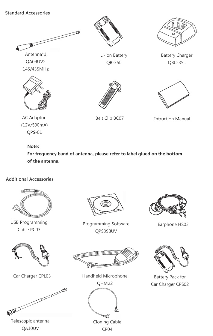 398UVE (USA only) VHF:136~174MHZ 220~260MHz(Rx) 222~225MHz(Tx)